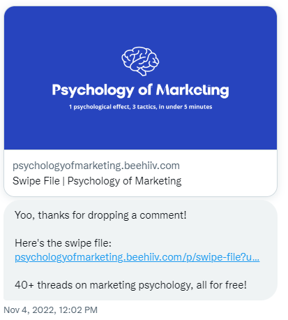 Step 1: publish a tweet enticing users to engage in exchange for a valuable piece of content (in this example, a swipe file of high quality marketing psychology threads). The engagement on the tweet tells the Twitter algorithm to distribute the tweet to a wide audience.
