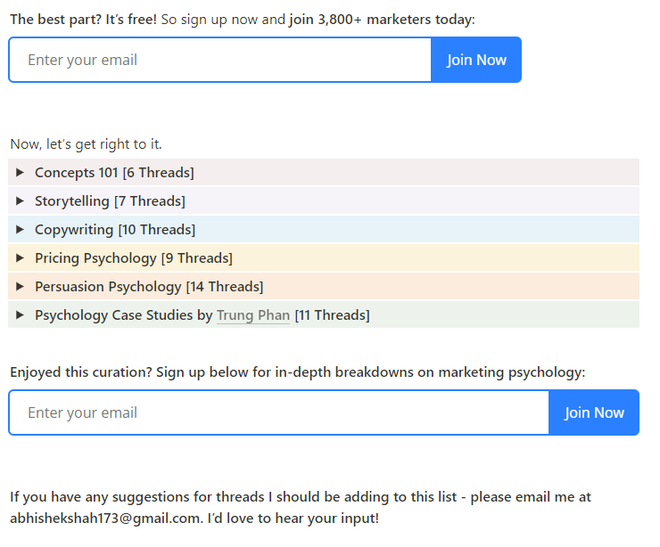 One of Abhi's growth tactics is to produce high quality content related to marketing psychology and then require folks to subscribe for access.