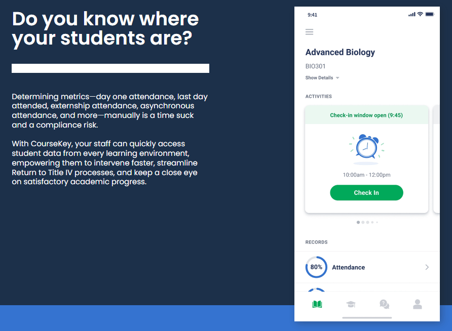 CourseKey created an automated, location-verified and secure way to manage attendance via smartphones. The "attendance" solution became their wedge product. It solved a problem that was painfully manual and had costly compliance implications.